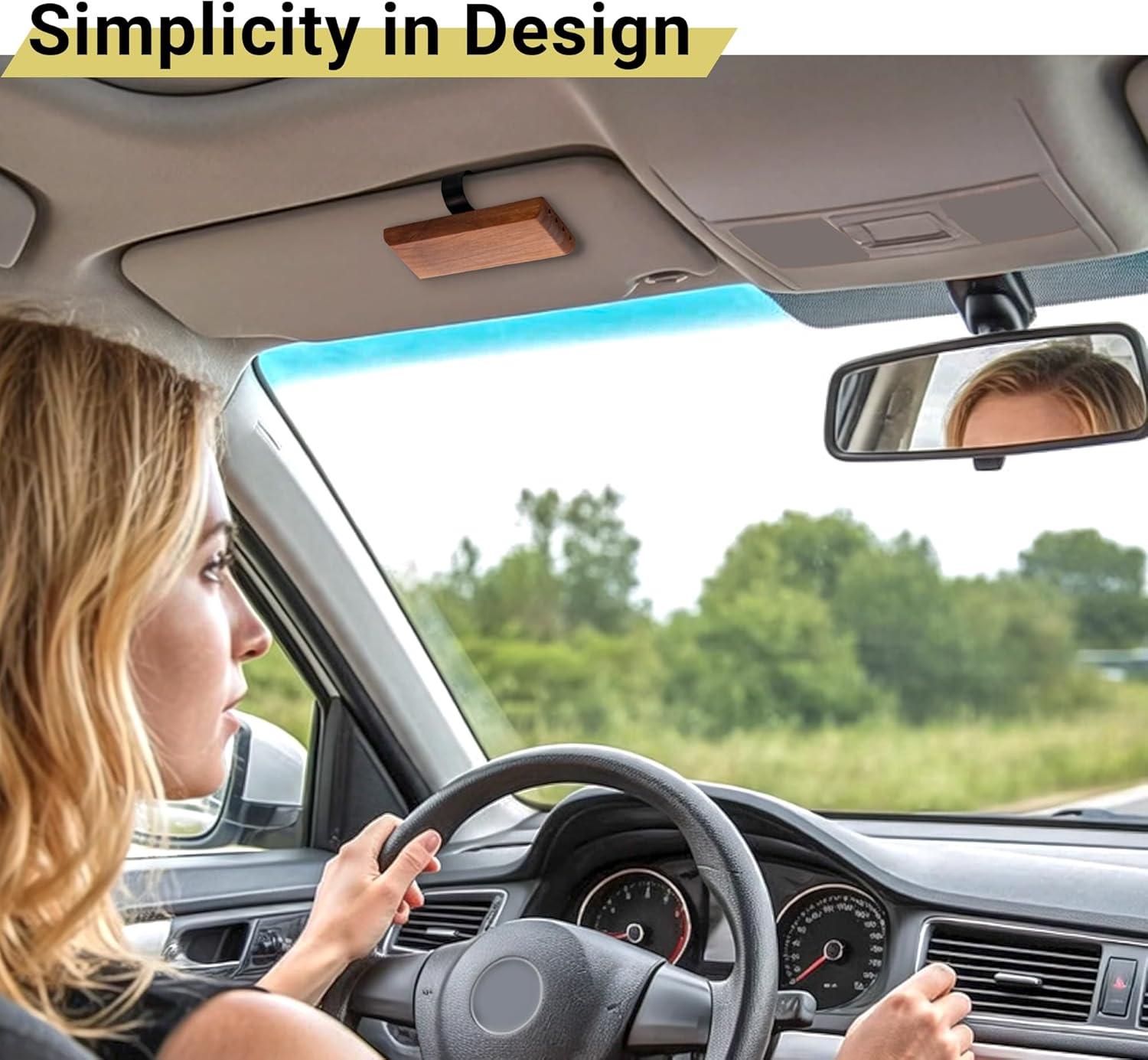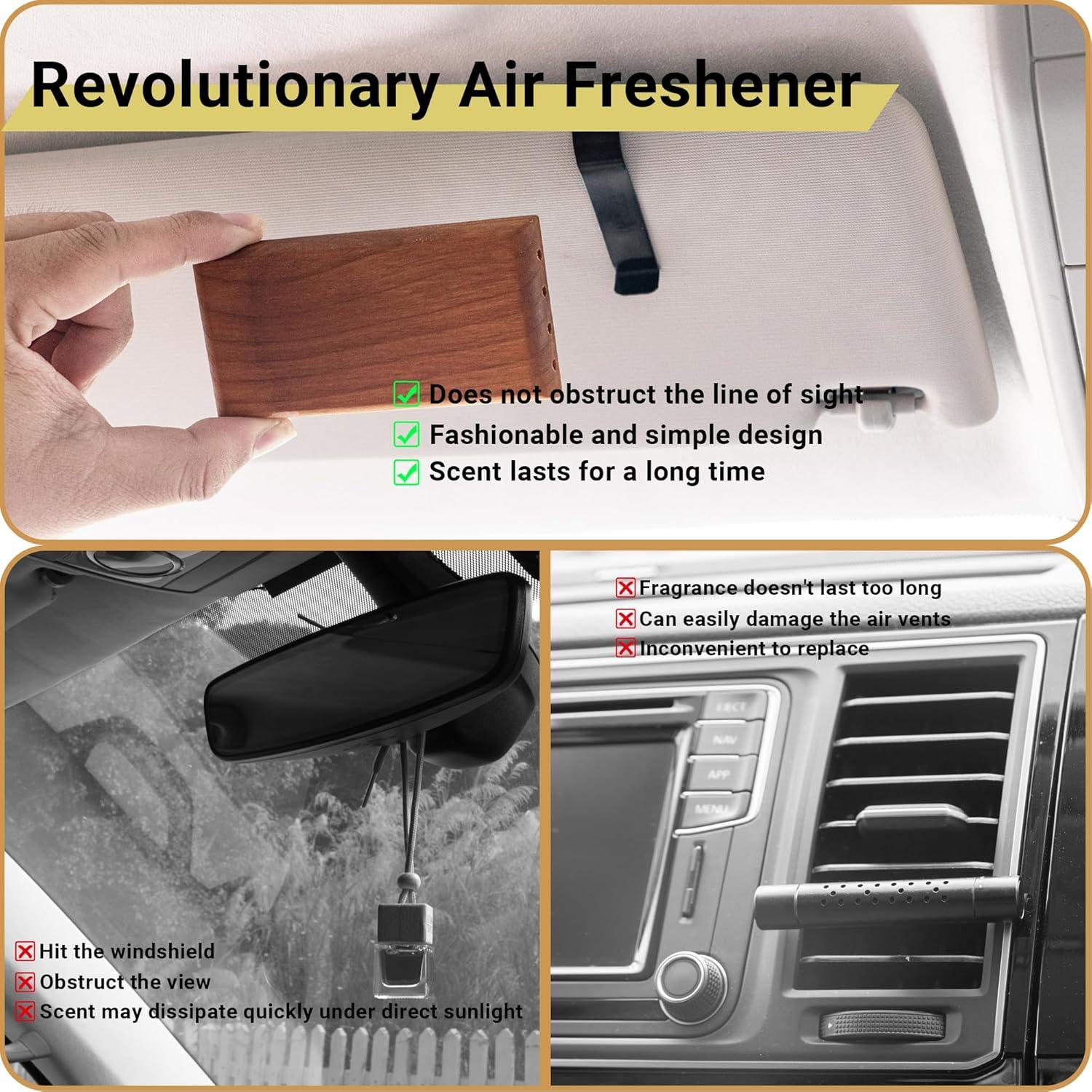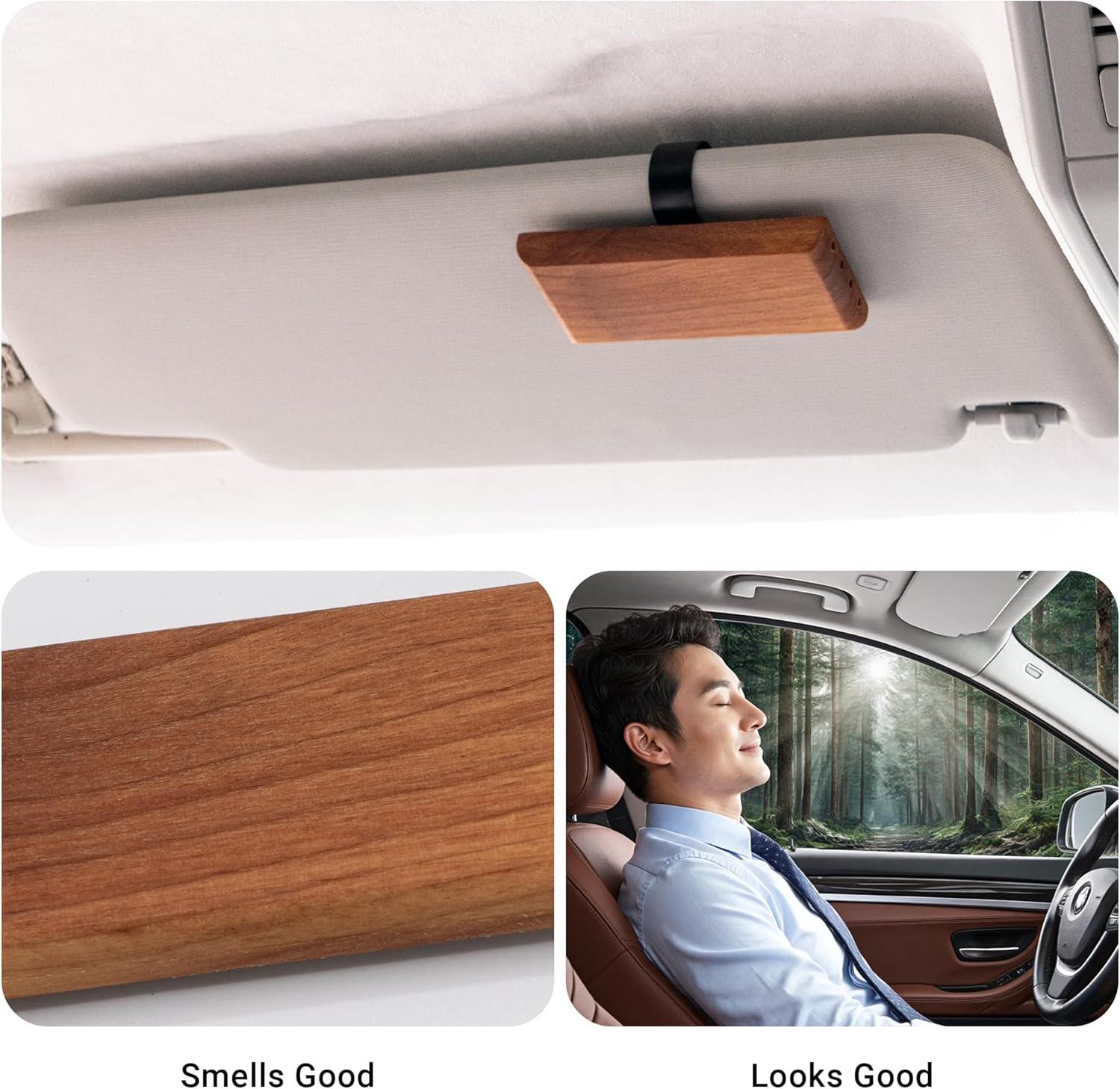 Sleek and Stylish Design: The product ingeniously connects the sun visor hook and the wooden fragrance piece magnetically, boasting a compact and elegant design that perfectly complements your car's interior.